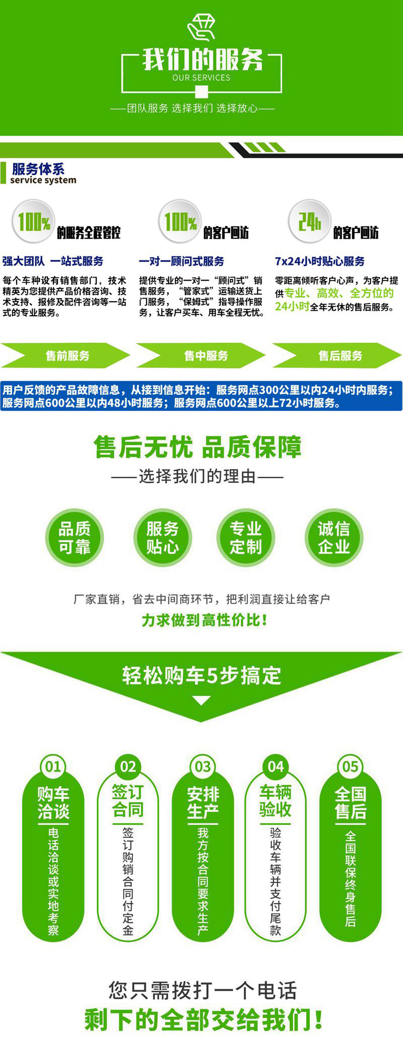 本公司是一家专用汽车企业。多年来经过公司全体员工的不懈努力,已形成一条完整的设计、销售、质量检测和售后服务的产业链。售后服务是我公司售前、售中和售后环节中的重要支柱。特别是近几年来随着公司能力的不断提升和出口贸易的展开,售后服务体系得到了完善。